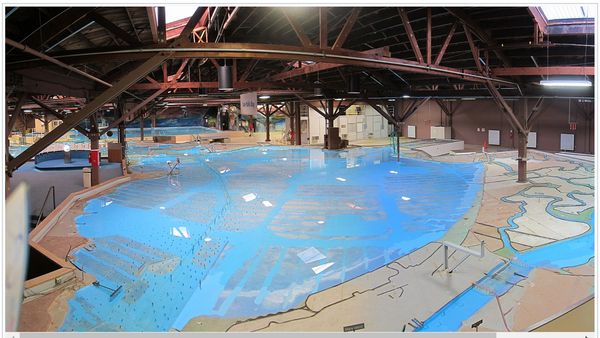 The U.S. Army Corps of engineers bay model is a working hydraulic scale model of the San Francisco Bay and Sacramento-San Joaquin River Delta system. While the Bay model is still operational, it is no longer used for scientific research but is instead opened to the public alongside educational exhibits about the Bay and hydrology. The model's construction was completed in 1957. The model is approximately 320 feet long in the north-south direction and about 400 feet long in the East-West direction. It was constructed out of 286/5-ton concrete slabs joined together like a jigsaw puzzle. The limits of the model encompass the Pacific Ocean extending 17 miles beyond the Golden Gate Bridge and include San Francisco Bay, San Pablo Bay, San Simeon Bay, and all the Sacramento River deltas. The scale of the model is 1 to 1000 on the horizon axis and 1 to 100 on the vertical axis. The model operates at a timescale of 1 to 100. The model is distorted by a factor of 10 between the rise in and vertical scale. This distortion is designed into the model to ensure a proper hydraulic flow over the tidal flats and shallows. Please view photos on the following pages